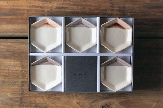 m.m.d.で一番人気のアイテム「取皿」をそのまま小さくした六角豆皿を、5枚セットで専用のギフトボックスに詰めました。
