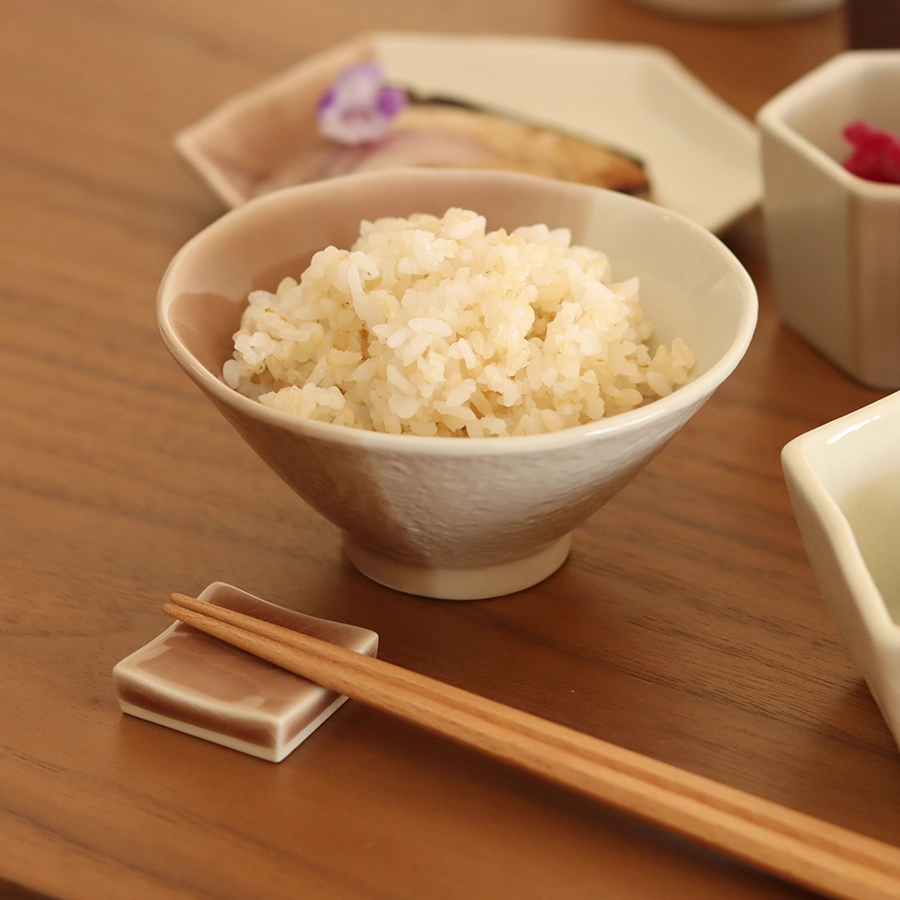 大きな特徴は広めの口。どんな方のてのひらにもなじむ形で、小盛りでも大盛りでも様になるので、家族おそろいでお使いいただくのもおすすめです。小さな丼としてもお使いいただけます。食卓の所作をすらりと美しく、日本製の六角箸