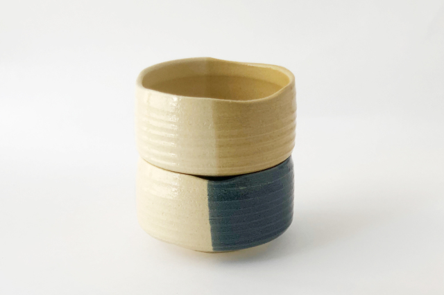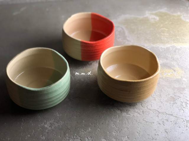 抹茶椀は、m.m.d.のアイテムを製造してくださっている窯元の1つである、瀬戸の生宝陶苑さんが手作業で入れられる側面の縞模様です。陶器をメインに、「水ゴテ」と呼ばれる動力成形は1つ1つ手で仕上げる、まさに手しごとです。