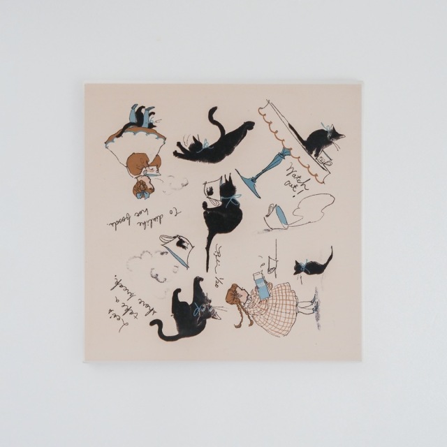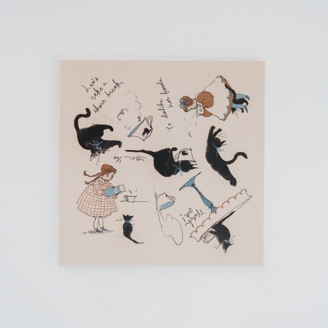 黒猫と女の子の午後のひとときが、くらはしさんらしいユーモラスな筆遣いで描かれています。生き生きとしたキャラクターは、手に取るたびにその背景にある物語へと手招きするよう。