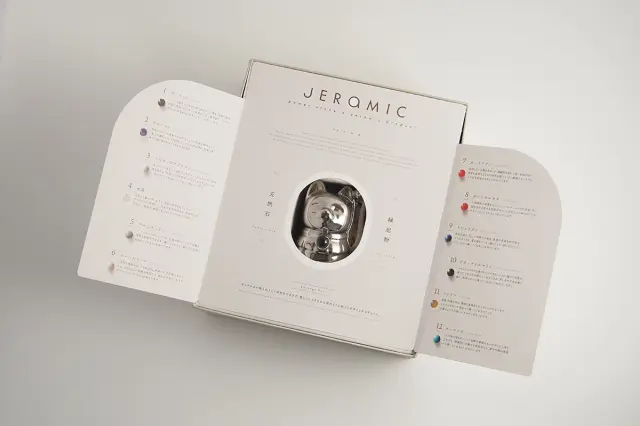 古くから開店祝い、開業祝いなどの贈りものの定番である「招き猫」。現代のライフスタイルに溶け込むシンプルなデザイン、首元には12種類の天然石がきらりと輝く特別なオブジェ「Jeramic」をつくりました。