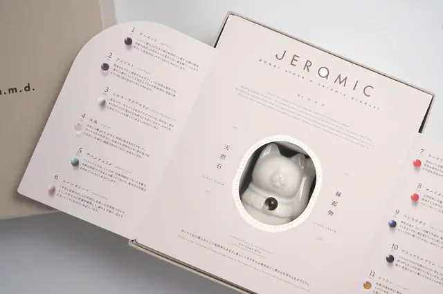 古くから開店祝い、開業祝いなどの贈りものの定番である「招き猫」。現代のライフスタイルに溶け込むシンプルなデザイン、首元には12種類の天然石がきらりと輝く特別なオブジェ「Jeramic」をつくりました。
