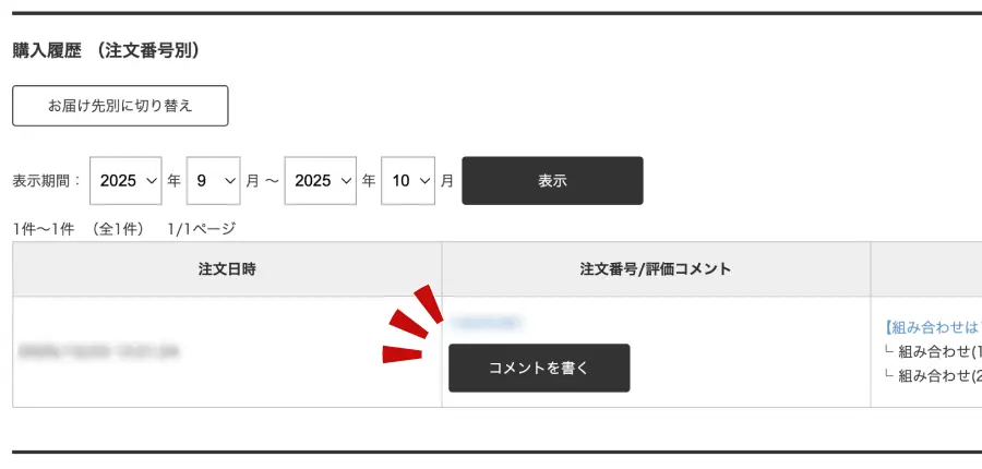 商品のレビューはマイページの「注文履歴」から発送済みの商品に「コメントを書く」ボタンが表示されますので、そちらからコメントをお願いいたします。