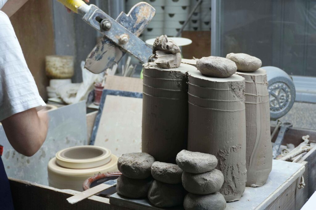 生宝陶苑のうつわづくりは、まず「土づくり」から始まります。瀬戸の山から採れる良質な陶土をもとに、代々伝わる独自の配合で、製品ごとに最適な土を練り上げていきます。
