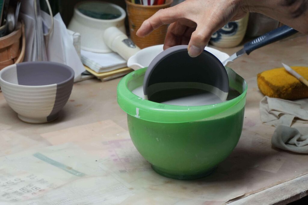 成形には「水ゴテ」と呼ばれる瀬戸伝統の技法が使われています。石膏型に粘土入れ、動力ろくろで回転させながら、水をうちながらコテで内側から形を整えていく技法です。
