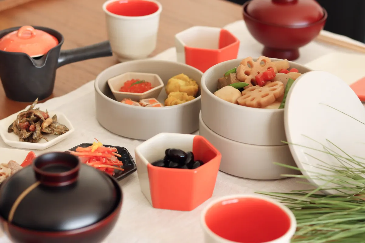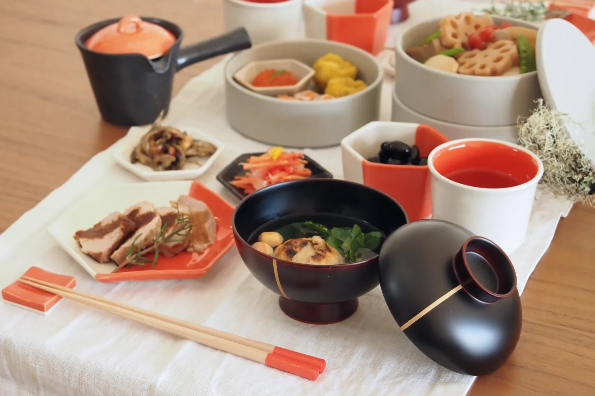 昆布や鯛などの縁起のよい食材を食事に取り入れることで、健康や喜びを願う文化もあります。料理と一緒に縁起物の良い形のお皿を使うことで、食事がより特別なものにもなります。